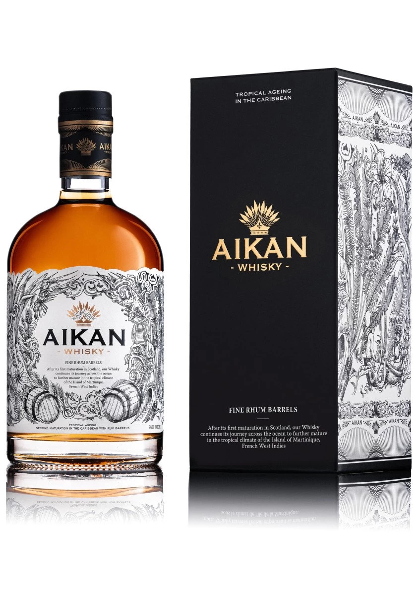 La marque Aikan a été créée avec l’idée de proposer un mariage audacieux entre deux alcools, deux traditions et deux cultures qui semblent être opposés : le whisky et le rhum. En effet, ces whiskys sont élaborés en Ecosse puis affinés dans d’anciens fûts de rhum. Pendant cette période de maturation, les saveurs se mêlent pour créer une alchimie délicate que nous découvrons avec émerveillement dès l’ouverture de la bouteille.
