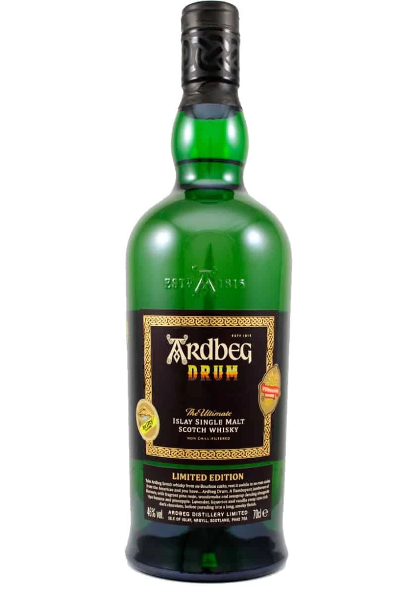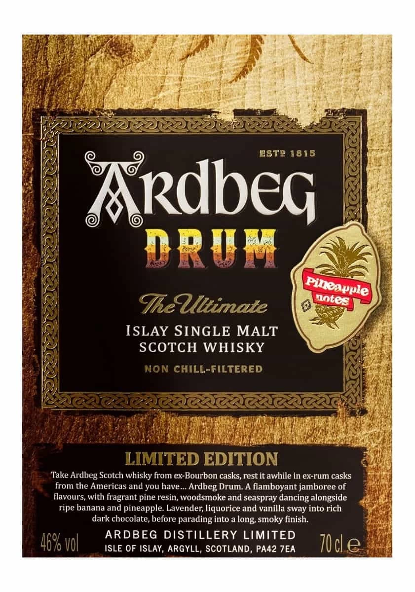 Ce Single Malt est issu d’une sélection de whisky Ardbeg provenant d’anciens fûts de Bourbon, vieilli dans un second temps en fûts de Rhum des Amériques. Il rend hommage à Hamish Scott qui, après avoir été directeur d’une rhumerie, est devenu le responsable de la distillerie Ardbeg entre 1964 et 1967. Ardbeg Drum puise ainsi dans les traditions caribéennes pour proposer un whisky avec une palette aromatique tourbée et exotique avec des notes d’ananas.