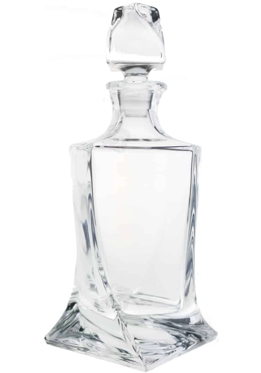 Carafe à spiritueux avec son bouchon. Elle présente une base légèrement twistée sur un verre cristallin très épais. Sa contenance est de 75 cl. Hauteur sans bouchon : 22 cm