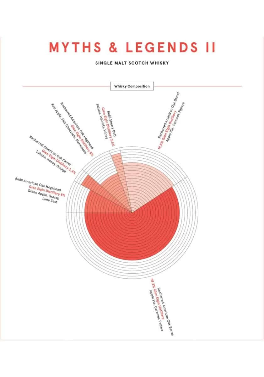 Myths & Legends II résulte d’une successions de décisions ayant impacté le profil aromatique du whisky. D’abord à la distillerie, dans le choix des fûts et des durées de maturation, puis lors de l’assemblage de ces malts aux profils divers et variés. La femme au centre de l’étiquette incarne toute l’importance de la saveur du whisky. La spirale dorée qui l’entoure évoque les refroidisseurs en serpentin encore utilisés dans une poignée de distilleries en Ecosse, dont celles qui entre dans la composition de ce single malt.