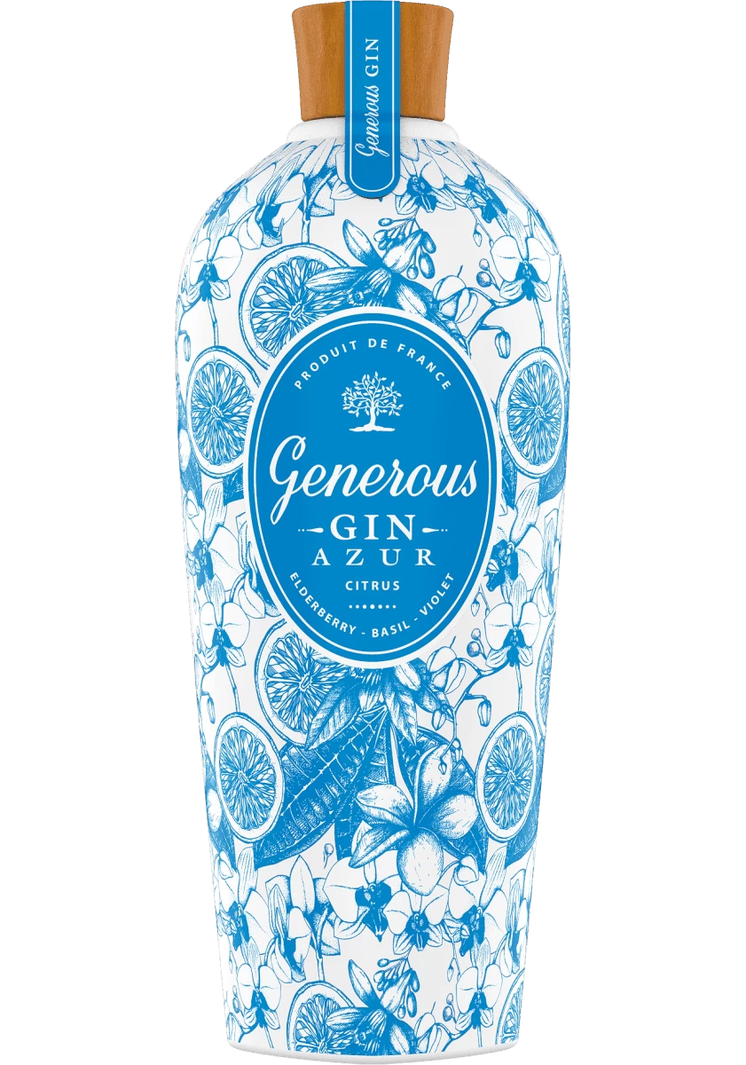«AZUR »décline les valeurs qui ont fait de Generous Gin un succès. Un packaging très fort, une offre sur un gin floral (Sureau et Basilic et Violette) avec des notes de genièvres fraiches qui se mêlent à de subtiles touches d’agrumes.