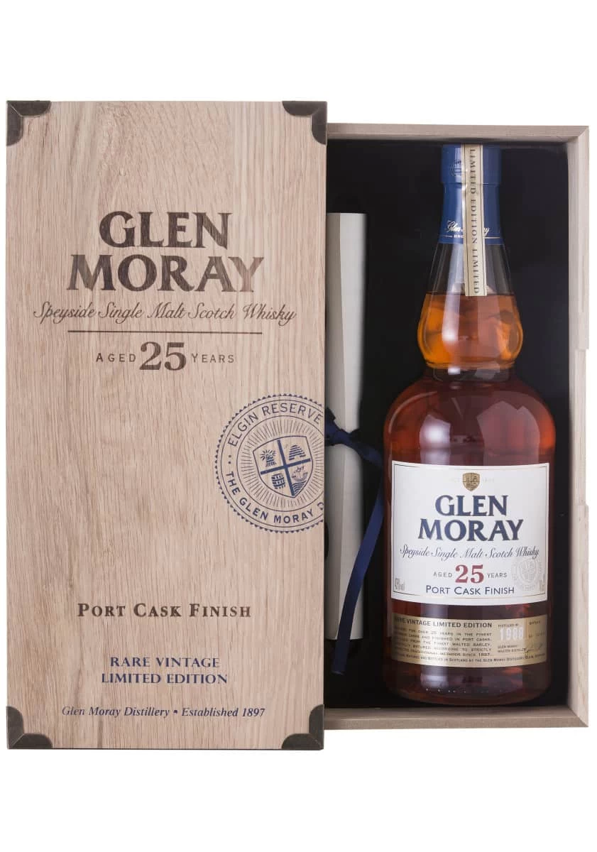 Glen Moray 25 ans est une édition limitée. Sa dernière phase de maturation s’est effectuée dans des fûts de porto sélectionnés parmi les meilleurs producteurs. Il en résulte un whisky unique aux arômes complexes de fruits tropicaux et aux saveurs légères de tourbe fumée.