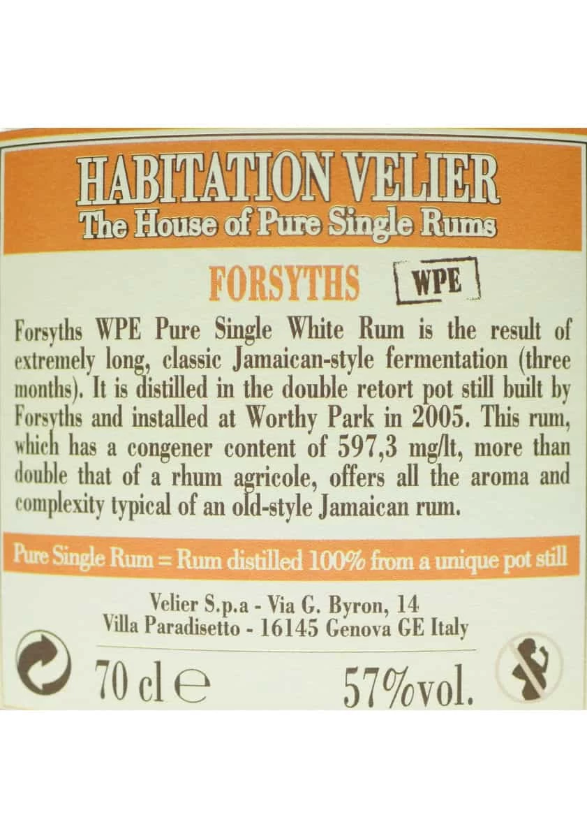 Bien qu’il existe plusieurs version du Worthy Park Blanc produites par des embouteilleurs indépendants, ce Forsyths WP 502 se distingue par son originalité : fermentation excessivement longue de 3 mois de style Dunder dont on a obtenu un rhum très haut en esters, 502mg/L. Puissant et aromatique.