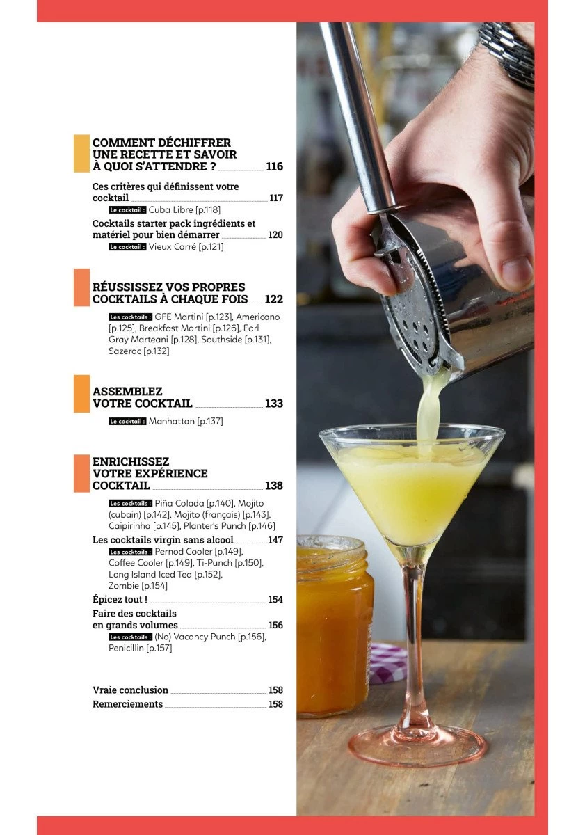 Ce qu’on aime dans les cocktails ; Entre science et plaisir ; Analyse des styles et influences ; L’importance des ingrédients ; Réussissez vos propres cocktails ; Démarrer en fonction de son budget.