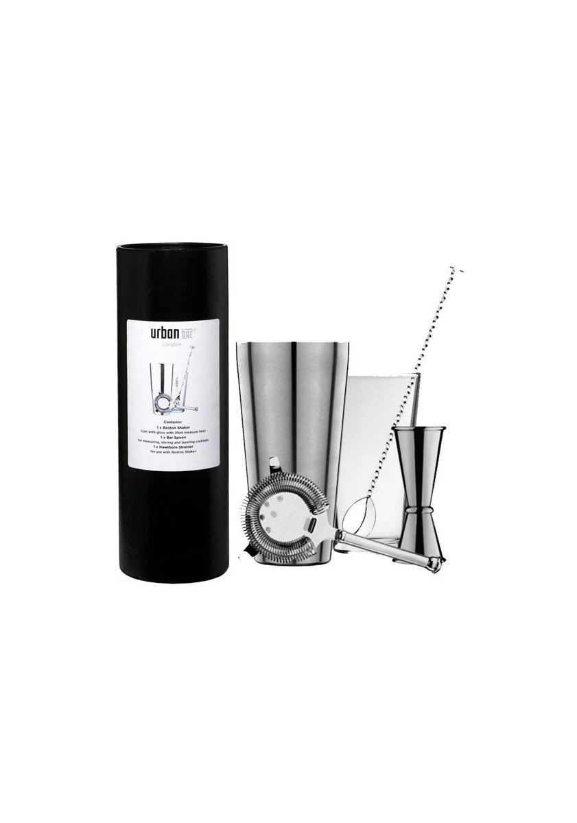 Ce coffret URBAN BAR Cocktail contient les éléments suivants – 1 x Boston Shaker- 1 x Cuillère de bar pour mesurer et mélanger- 1 x Strainer Hawthorn à utiliser avec le Boston shaker- 1 x Jigger Ginza