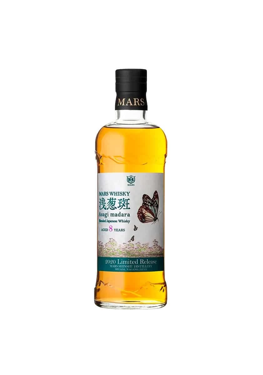 Le papillon Asagimadara (Parantica sita) sur l’étiquette, connu pour migrer sur de longues distances, peut être contemplé dans le village de Miyada, où se trouve la distillerie, durant le mois de septembre. Asagi Madara est le premier blended whisky crée par Mars assemblant uniquement des whiskies du Japon et vieilli 8 ans.