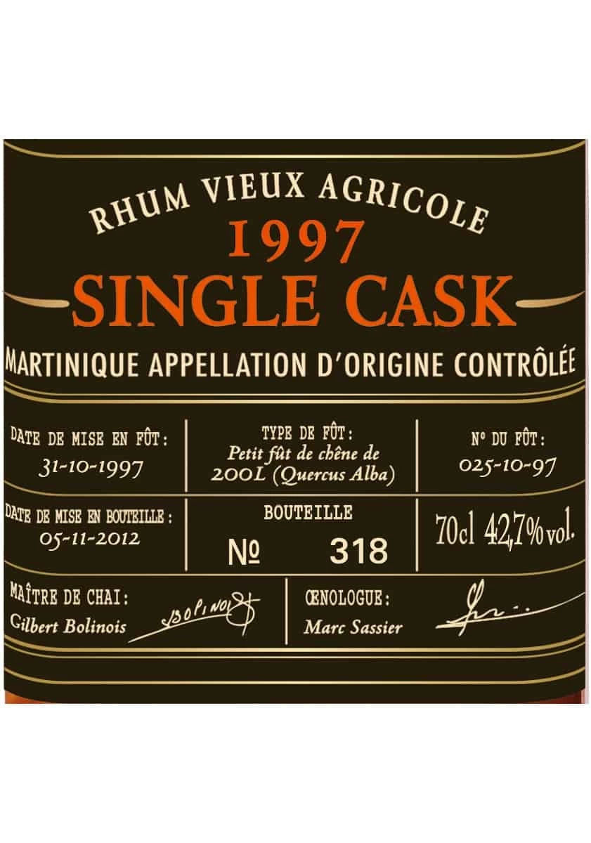 Après l’immense succès du millésime 1999 et 1998, la maison Saint James, son maitre de chais Gilbert Bolinois et son oenologue Marc Sassier, ont fait le choix d’embouteiller ce fût unique, issu de la distillation de 1997 –